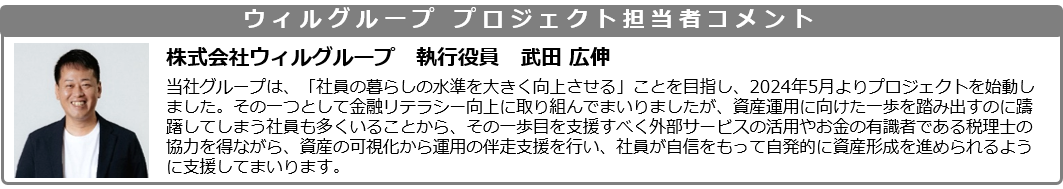 株式会社ウィルグループ(本社:東京都中野区、代表取締役社長 角 裕一)は、社員の「ファイナンシャル・ウェルビーイング※1 (経済的幸福)」向上を本気で推進するために、家計簿・資産管理アプリ「マネーフォワード ME」を提供するマネーフォワードホーム株式会社(本社:東京都港区、代表取締役社長 金坂 直哉)と外部アドバイザーの税理士と連携し、伴走型プロジェクトを始動しました。