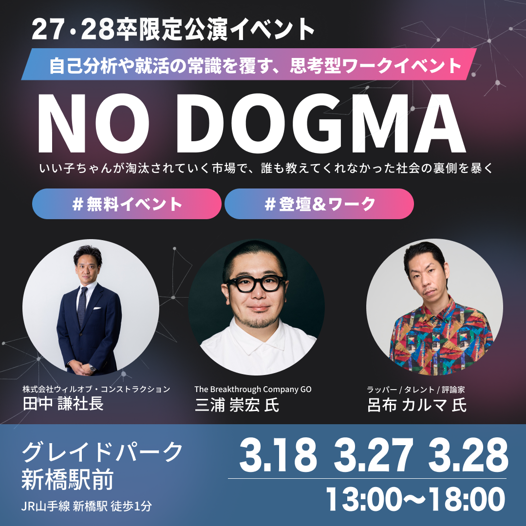 【27・28卒新卒限定イベント開催】「NO DOGMA ーその就活、本当に合ってる?」- 特別ゲスト登壇 | 就活の”常識”を問い直す1DAY-